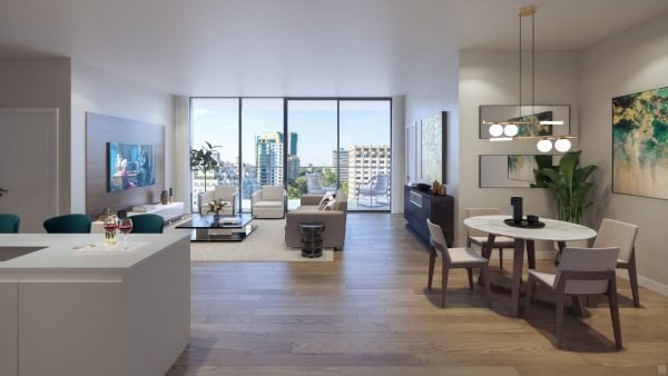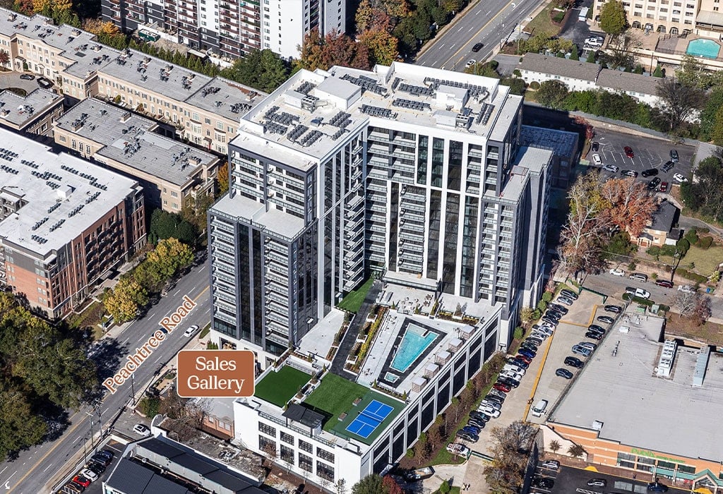 The Dillon Buckhead features 144 elegantly appointed residences, including one- to three-bedroom units, Estate Homes, and Penthouses. Floor plans range from approximately 1,400 to nearly 3,800 square feet, each boasting expansive private terraces, soaring ceilings (10' to 12'), and floor-to-ceiling windows that flood interiors with natural light. Interior finishes include Italian-made cabinetry, quartz countertops, hardwood floors, and spa-like bathrooms.